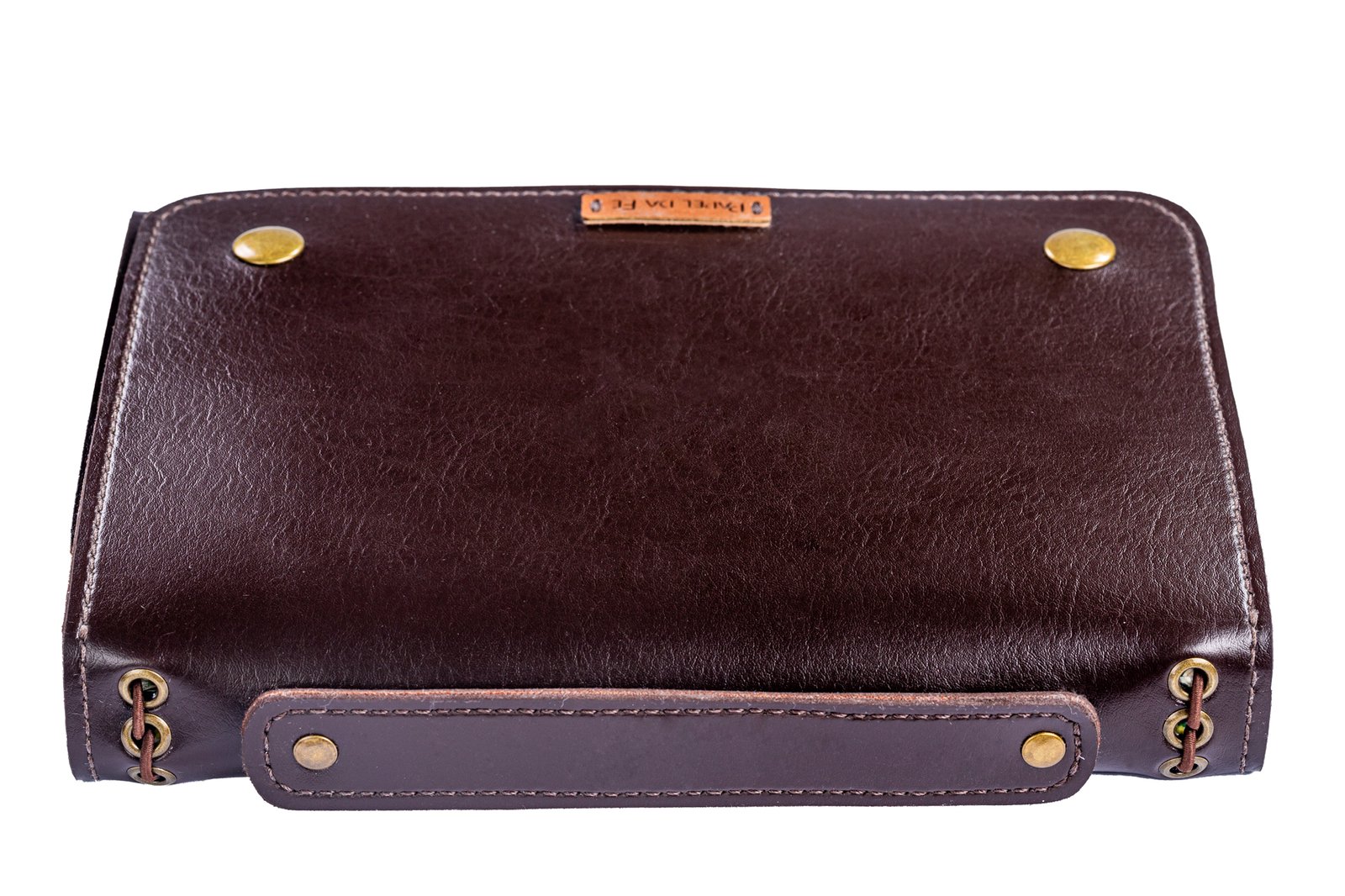 Feito de couro sintético Montana, com 2 bolsos internos, ferragens em latão inoxidável, alça para transporte, encaixe para 1 caneta/lápis, elásticos para 4 cadernos e espaço para inserir bloco de notas.
