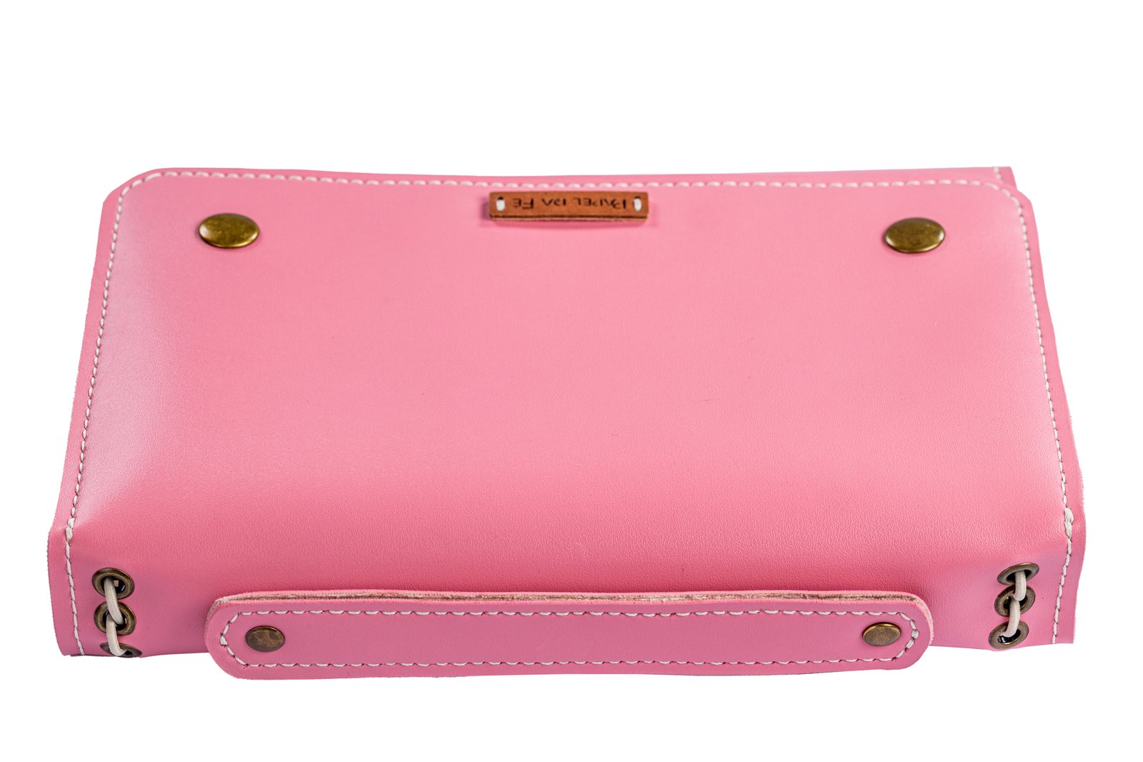 Feito de couro sintético Montana, com 2 bolsos internos, ferragens em latão inoxidável, alça para transporte, encaixe para 1 caneta/lápis, elásticos para 4 cadernos e espaço para inserir bloco de notas.